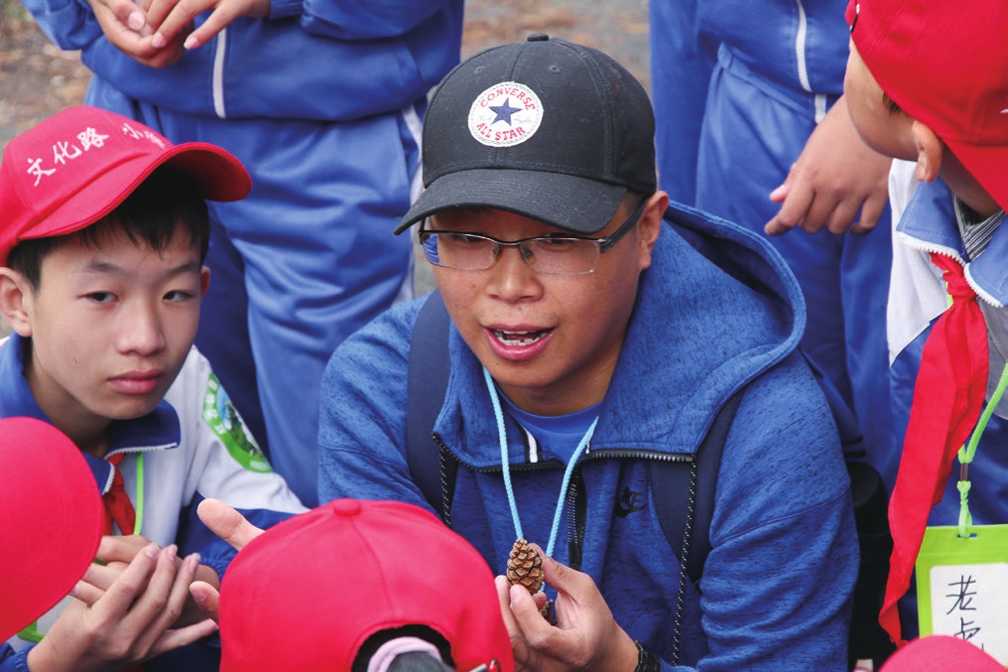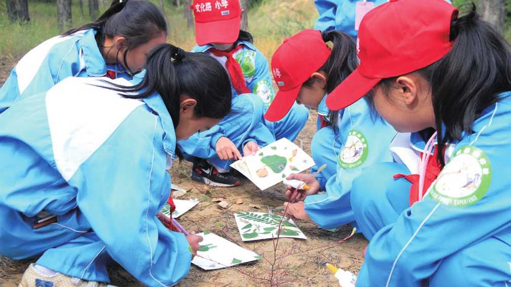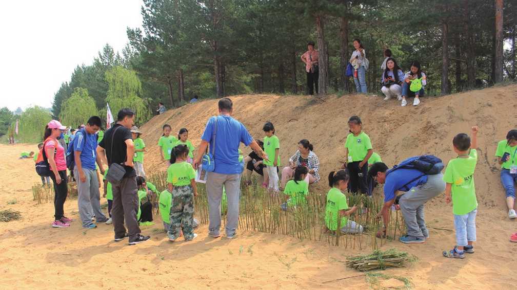 再比如在基地内的沙丘最高的地方,景色优美,东西南北各不相同。这里叫“沙漠生态感知区,”就是想让孩子们从内心深处感受沙漠的变化。分享的过程是:当孩子们踩着软软的沙粒,穿过齐腰高的灌木林,爬上高高的沙丘,举目远眺四周的景色,然后,请大家手拉手围成一个圆圈,轻轻的闭上眼睛,静静的听。想象一个画面:现在呢,头顶是蔚蓝的天空,脚下是奔流不息的榆溪河,东边是雄伟的镇北台,西边是一块块整整齐齐的农林田地,北边是绿油油的松柏林,南边是熙熙攘攘的城市——榆林。请慢慢的想一想,天空、脚下、东边、西边、北边、南边,感受1分钟……好,继续:曾经的城市在北边,自己脚下的地方是一片肥沃田地,多少年来的风沙侵蚀和人类的开垦,终于有一天自己的脚下也变成了一片漫漫黄沙。这里风沙飞扬,植物都被埋进了沙子里,动物跑的无影无踪,沙粒吹打在人们的脸上、身上,沙丘一片连着一片,沙丘掩埋了村庄、城市,逼迫着人们背井离乡。人们开始思考自己的过错,向沙漠宣战。于是,人们开始种草植树。爷爷奶奶种过,爸爸妈妈种过,一颗一颗种,一株一株栽,终于一大片一大片的沙漠披上了绿色的衣裳,花开了,鸟儿飞来了,动物们住下了,今天我们也来了,这片土地就在你我的脚下。很神奇,引导员自己每次闭着眼睛过一遍,好像回到了那个黄沙漫天的年代,回到了轰轰烈烈治理沙漠的场景中。这就是“参与式”。